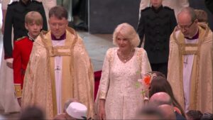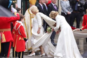 The King and Queen exited the carriage as Westminster Abbey’s bells tolled. Camilla was the first to leave, followed by Charles after a brief pause outside the cathedral.