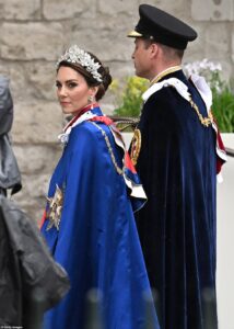 As the royal entourage entered Westminster Abbey, Prince George was carrying a corner of his grandpa, King George VI’s, trailing robes.